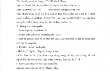 BẢN TỰ CÔNG BỐ CHẤT LƯỢNG SẢN PHẨM NẤM LINH CHI